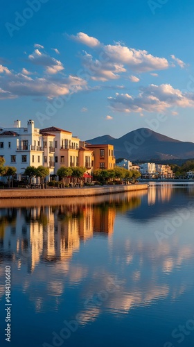 Fototapeta premium Waterside villas reflecting mountain backdrop sunny vista