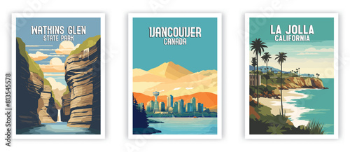 Obraz premium Watkins Glen, Vancouver, La Jolla Illustration Art. Travel Poster Wall Art....