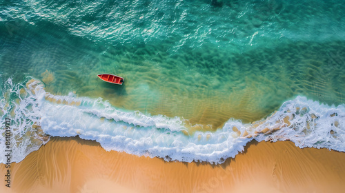 © Generative AI, Fototapeta premium Wave and boat on the beach as a background Beautiful natural background at the summer time from air : Generative AI