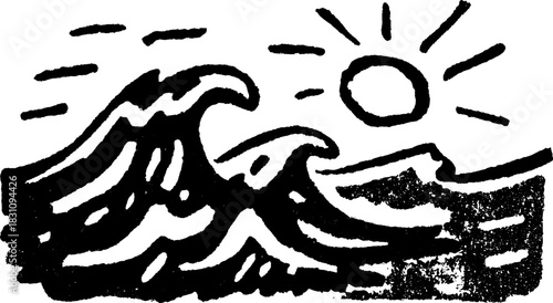 © Good moose, Obraz premium Wave and sun silhouette in black outline drawing. Simple illustration showcasing nature and ocean elements in a hand-drawn vector style.