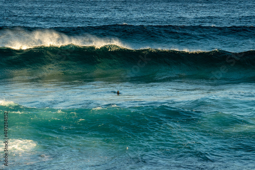 Fototapeta premium wave breaking in the ocean with Bodysurfer swimming in the waves