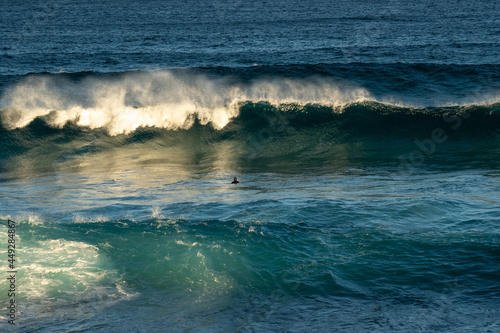 Fototapeta premium wave breaking in the ocean with Bodysurfer swimming in the waves