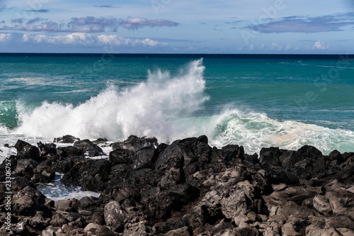 Fototapeta premium Wave breaking on the western Kona coast of Hawaii's Big Island near South Point. White sea spray thrown into the air; Deep blue-green Pacific ocean, and blue sky with clouds in the background.