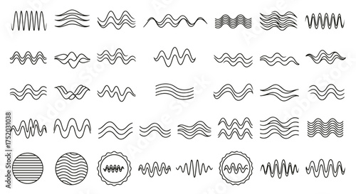 Fototapeta premium Wave line icon set. Collection of water, sea, soundwave and vibration symbols. Abstract wavy lines for logo, divider or pattern. Audio frequency and equalizer graph elements.