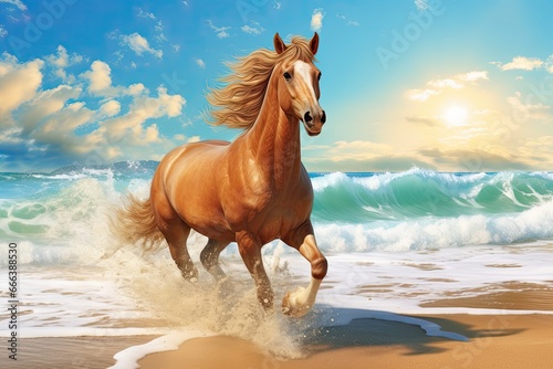 © Michael, Fototapeta premium Wave of the Sea and Horse on Beach: Captivating Coastal Scenery on Sandy Shores