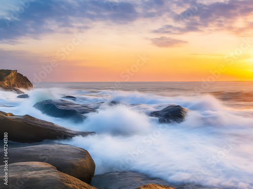 Fototapeta premium Waves and rocks on beach of sunset AI Generated