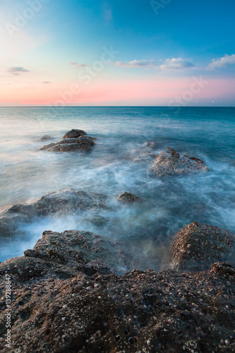 © Juhku, Fototapeta premium Waves and rocks shore long exposure