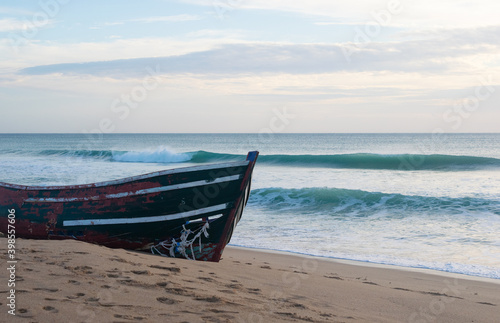 Naklejka premium Waves breaking behind abandoned patera boat at the beach of Mangueta in...
