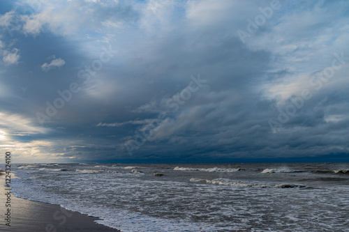 Fototapeta premium waves breaking on rocks after sunset close Palanga, Lithuania
