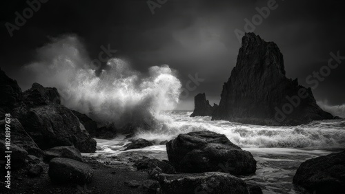 © Cedric, Obraz premium Waves Crash Against Rocks in Dramatic Ocean Scene