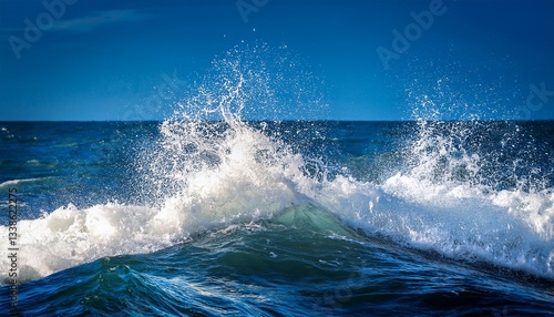© eliyashevskiy, Fototapeta premium Waves Crash Against the Shore Under a Clear Blue Sky Creating a Refreshing Coastal Atmosphere