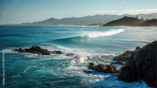 Fototapeta premium Waves crash on a rocky coastline on a sunny day by the ocean