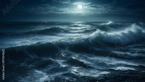 © RAMESH, Obraz premium Waves Crash Under a Full Moon Illuminating the Dark Ocean at Night With Dramatic Clouds in the Background