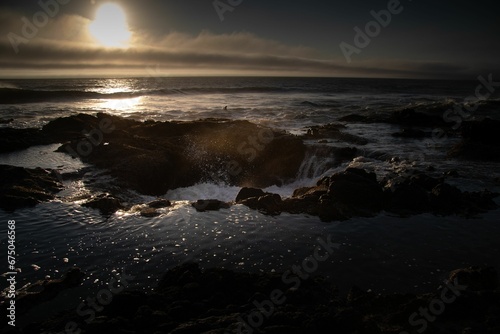 © Wirestock, Obraz premium waves crash up against the rocks at sunset on a rocky shore