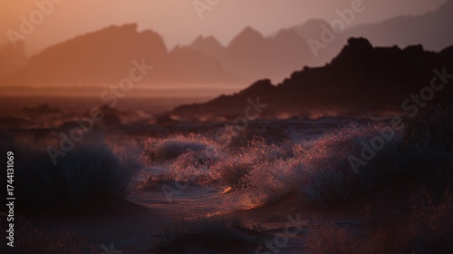 Fototapeta premium Waves crashing gently on shore at sunset near rocky mountains in serene...