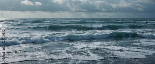 Fototapeta premium Waves crashing on a shoreline under cloudy summer skies with empty space for...