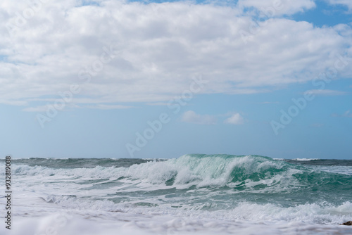 © Iryna, Fototapeta premium Waves Crashing on Sunny Beach Under Partly Cloudy Sky in Afternoon
