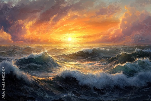 © Dzikrul Husnani, Fototapeta premium Waves in the sea and a hundred thousand sun, ai