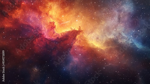 Naklejka premium Waves of nebulae swirling in cosmic harmony, a rich blend of colors with soft light transitions and starry accents.