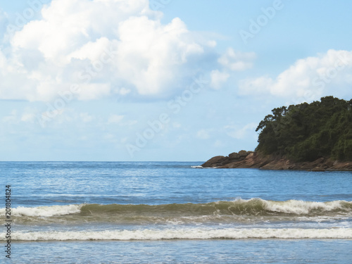 © silviopl, Fototapeta premium Waves on the beach with island to the background in sky with clouds.