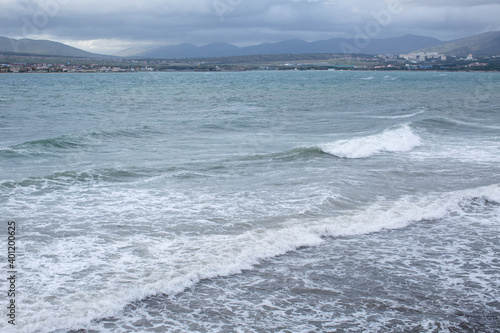 © Елена Дроздова, Fototapeta premium Waves on the sea in bad weather