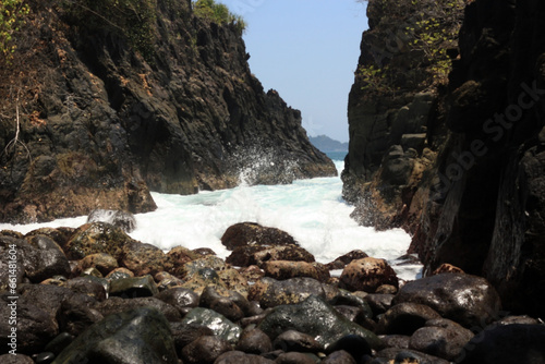 © Max Asrory, Obraz premium Waves splashing against rocks and pebblesin the seashore. Bright sunny day in the rocky beach.