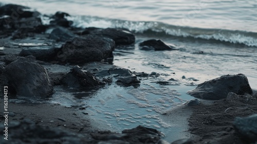 © AnImagine, Fototapeta premium Waves Washing Over Rocky Beach at Evening Light