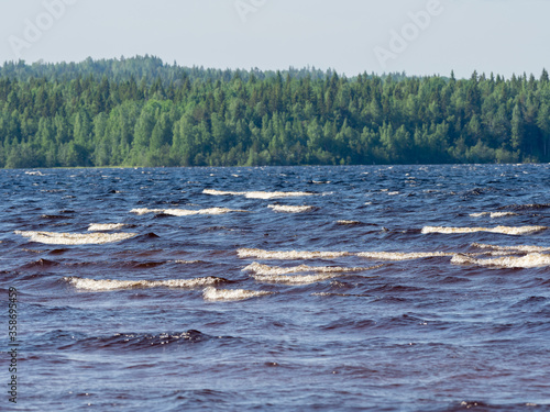 Obraz premium Waves with white foam on a lake with shallow depth in a sunny, windy day in Karelia, northwest of Russia