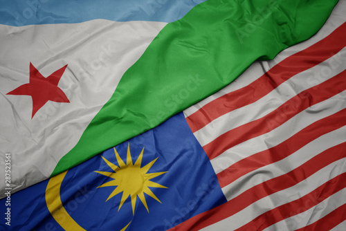 Fototapeta premium waving colorful flag of malaysia and national flag of djibouti.