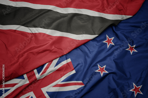 © luzitanija, Fototapeta premium waving colorful flag of new zealand and national flag of trinidad and tobago.