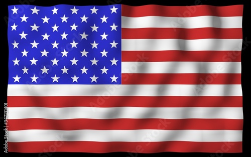 © Plastic man, Naklejka premium Waving flag of the United States of America on a dark background. Stars and Stripes. State symbol of the USA. 3D illustration