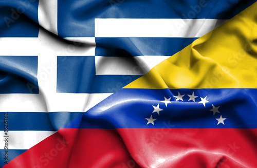 © irishmaster, Fototapeta premium Waving flag of Venezuela and Greece