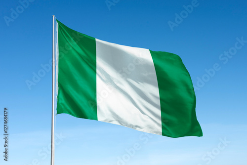 Obraz premium Waving Nigerian flag, national symbol, blue sky