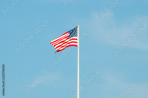 Fototapeta premium Waving USA flag on blue sky.