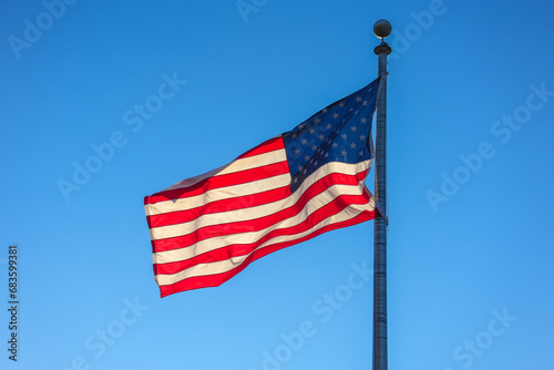 © nd700, Fototapeta premium waving USA flag on pole against blue sky