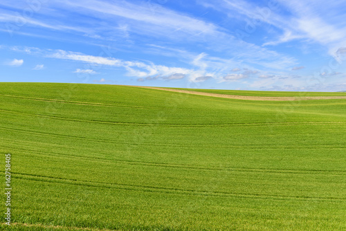 © Cinematographer, Fototapeta premium Wavy green field with cloudy blue sky
