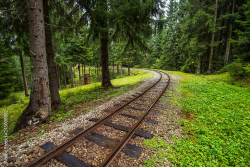 © Martins Vanags, Obraz premium wavy log railway tracks in wet green forest with fresh meadows