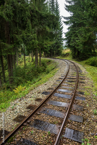 © Martins Vanags, Fototapeta premium wavy log railway tracks in wet green forest with fresh meadows