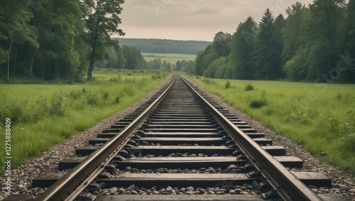 Fototapeta premium Wavy Railroad Tracks Stretching Through Lush Green Meadow Under Overcast Sky...