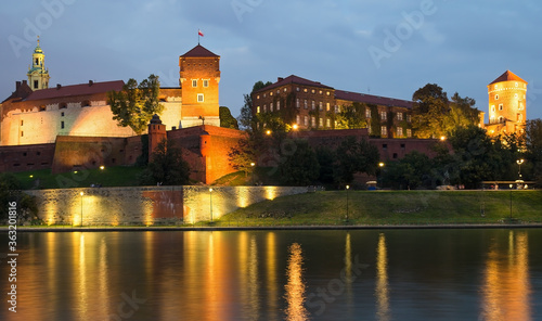 Fototapeta premium Wawel Castle lit up at night viewed from across the River Vistula.