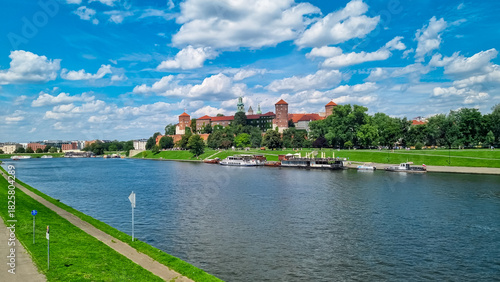 © Chris, Fototapeta premium Wawel Royal Castle sits proudly on its hill overlooking the Vistula River under a beautiful blue sky with fluffy clouds. Tourist boats are docked at the riverbank, ready for sightseeing tours.