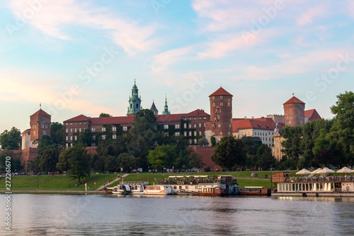 Fototapeta premium Wawel royal castle view from across the river Vistula (Wisla) at sunset