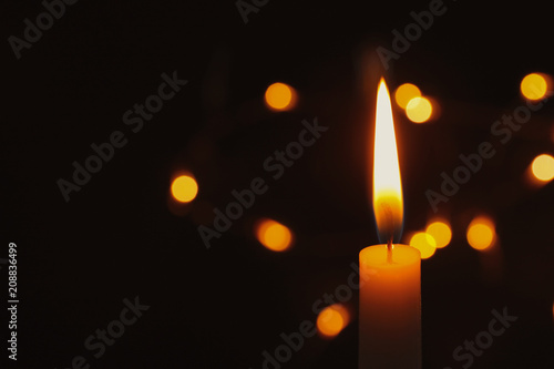 © New Africa, Fototapeta premium Wax candle burning on blurred background, closeup