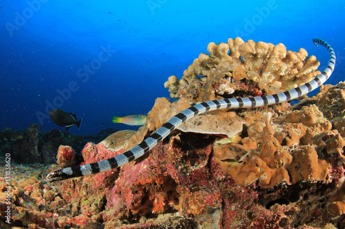 © Richard Carey, Naklejka premium Wąż morski pręgowany pod wodą