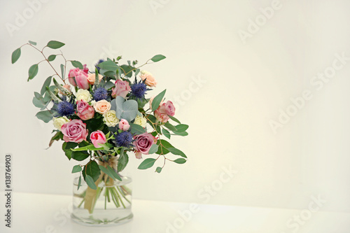 Fototapeta premium Wazon szklany z pięknym bukietem na jasnym tle