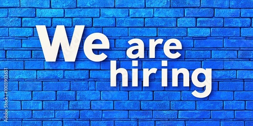 © ArtmediaworX, Fototapeta premium We are hiring text on the blue brick wall. Concept of employment. Generative Ai