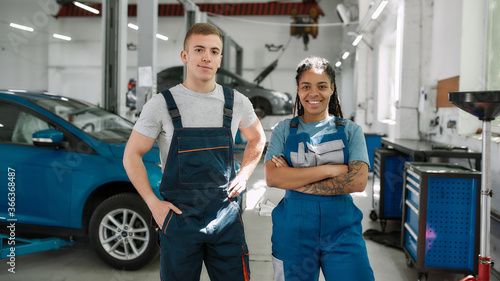 Obraz premium We value your need. Young african american woman and caucasian man, professional female and male mechanic smiling at camera, standing in auto repair shop