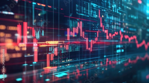 Fototapeta premium Wealth and investment growth represented by a digital bar chart and an upward red trend line.