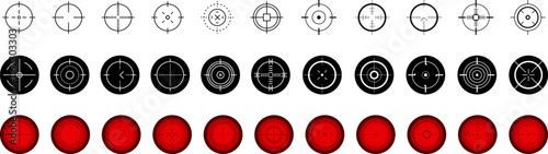 © Volodymyr, Obraz premium Weapon sight, sniper rifle optical scope. Hunting gun viewfinder with crosshair. Crosshair gun sight icons set. Bullseye, target or aim symbol. Shooting mark. Military target sign. Game UI. Vector.