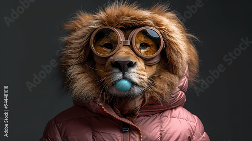 © Boris, Fototapeta premium Wearing a pink jacket and goggles, with a blue bubble in mouth